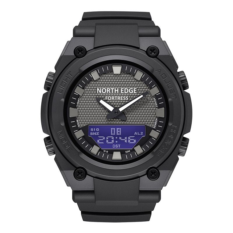 The FORTRESS outdoor watch combines analog elegance with digital precision. Featuring world time for 33 zones, stopwatch, countdown, multiple alarms, and luminous LED backlight, it ensures accurate tracking day or night. With 5 ATM water resistance, FORTRESS is durable, stylish, and ready for any outdoor adventure or daily wear.